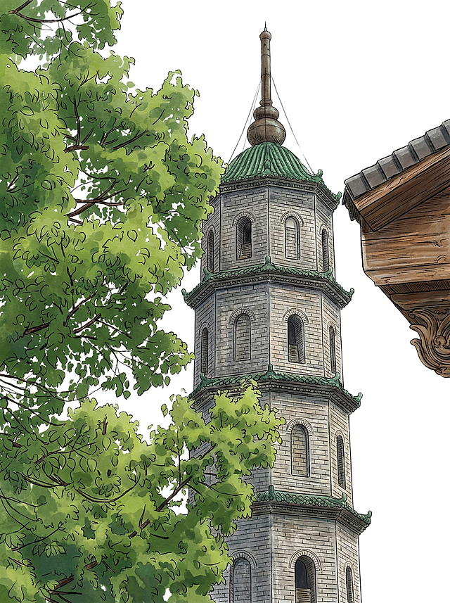 仅保留古塔建筑部分,将其转换为清新插画风格,保留古塔原有的结构、石材纹理和颜色细节,去除周围的树木、建筑、栏杆等所有多余环境元素,干净纯色背景,突出古塔主体,画质清晰详情
