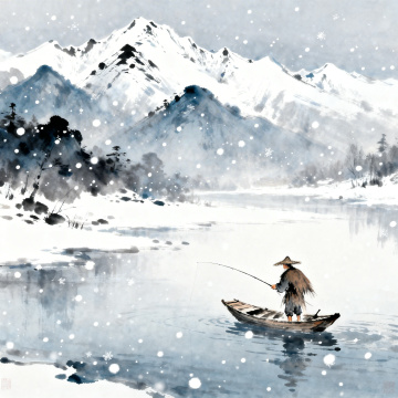 俯瞰视角,中国传统泼墨山水风格,浅米色宣纸底色上,以浓淡不一的墨色皴擦出层叠交错的喀斯特峰林,群峰如雨后春笋般从江面拔地而起,主峰以焦墨勾勒轮廓,次峰以淡墨晕染,远山则融入氤氲的灰蓝雾气中。画面中央是蜿蜒如银带的江面,以极细的飞白笔触表现流动的水波,一叶乌篷船正从两座对峙的山峰间缓缓驶出,船头渔翁身披蓑衣,斗笠遮住面容,仅露出持竿的剪影。左侧峭壁上垂挂着几缕墨色藤蔓,其间点缀着几点朱砂色的野山桃,与远处淡赭石色的山影形成微妙呼应。近景水面漂浮着三五片残荷,墨色荷叶以侧锋扫出,留白处形成晶莹的露珠。整体构图遵循"高远-深远-平远"三远法,大量留白营造出"江流天地外,山色有无中"的空灵意境,色调以墨色的浓淡变化为主,仅在细节处点缀赭石与朱砂,呈现出淡泊中蕴含生机的东方禅意。