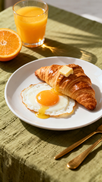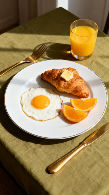 一张美学极简风格的早餐场景,摆放在餐桌上,金色阳光洒入,包含完美煎制的太阳蛋、涂了黄油的可颂面包、新鲜橙子切片和一杯明亮的橙汁,白色烤漆餐盘搭配优雅金色餐具,营造现代美学氛围,餐桌上铺着橄榄色桌布,柔和自然光影,高细节呈现,电影级构图,超高清画质