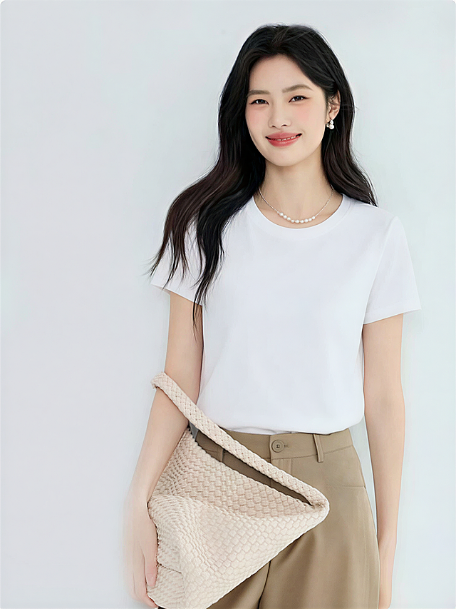 以图1模特姿势和场景为模板,将这件白色中袖圆领短袖套在模特身上,保持模特原姿势、原场景不变,比例1:1详情