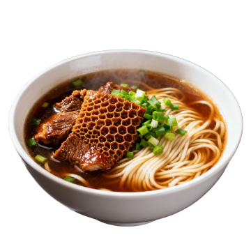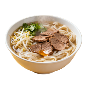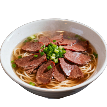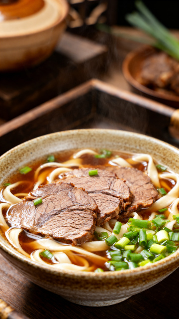 顶视角度,一碗黑色的碗里装着飘香的牛肉面,面条根根分明,汤色浓郁,上面撒着鲜红的辣椒和翠绿的葱花,热气腾腾,散发着诱人的香气,画面清晰,色彩鲜艳,细节丰富