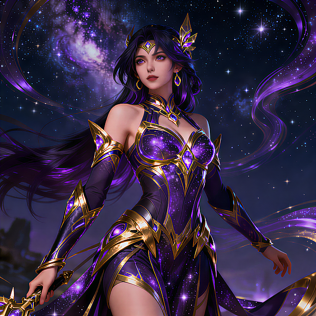 杰作,最佳质量,1名28岁女孩,美丽的中国风脸庞,半身肖像,来自《斗罗大陆2》,游戏动漫女孩,长发,施法动画,战斗动画,佩戴金色发饰,穿着精美的白色和紫色渐变裙,带有金色盔甲般装饰,复杂的金色图案,宝石点缀,短袖,褶裙,精致手套,电影感光影,背景为古风室内场景,夜晚,简约背景,散景效果,正面视角,高跟玻璃鞋,3D渲染,真实光影,超高细节,电影感,色彩鲜艳详情