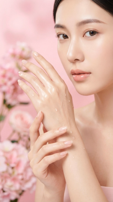 一张以女性面部为特写的美妆护肤主题照片,采用柔和的自然光从上方和侧面均匀照射,营造出明亮、纯净、温暖的氛围。画面中,一位年轻女性闭着双眼,嘴角微微上扬,露出恬静愉悦的微笑,双手轻轻捧起脸颊,姿态自然放松。她的皮肤呈现出极致的清透感、水润光泽和健康的粉嫩色调,肌肤表面仿佛覆盖着一层薄薄的精华液或保湿霜,反射出细腻的光泽,毛孔细腻几乎不可见,质感光滑柔嫩,充满弹性。深棕色的长发柔软地垂落在脸颊两侧,发丝轻盈飘逸,部分细碎的发丝自然散落,增添了画面的灵动与真实感。整体色彩以柔和的米白色为背景,衬托出肌肤的白皙与粉嫩,色调统一和谐,光影过渡自然,高光区域集中在额头、鼻梁、颧骨和下巴等面部高点,阴影柔和地勾勒出脸部的立体轮廓。照片的视觉焦点完全集中在女性完美无瑕的肌肤和愉悦的表情上,构图简洁大方,以人物面部为中心,背景干净无杂物,突出展现皮肤的水润状态和健康美感,传递出舒适、放松、享受护肤过程的情感,具有高度的视觉吸引力和信息传达效率,符合美妆护肤产品目标受众对理想肌肤状态的审美追求。