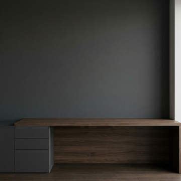极简主义风格厨房内部设计,保持原有厨房布局样式,灰色大理石台面搭配白色与深灰色组合橱柜,黑色大理石纹理的后挡板,台面中央放置黑色碗内有红黄梨子和苹果,背景台面上有绿色盆栽、木质砧板、白色陶瓷花瓶和厨房小家电,嵌入式暖黄色条形灯带照亮墙面,整体采用柔和自然光与室内灯光结合的照明效果,营造简洁、现代、高级的空间氛围,材质表现注重大理石的细腻纹理和光滑质感,橱柜的哑光表面处理,画面构图保持原有的视角和物体摆放位置关系。