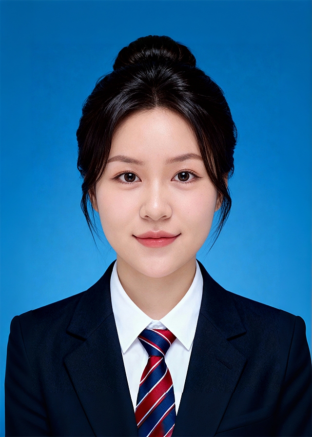 参考第一张图保留人物脸型和发型特征生成证件照标准样式;美颜轻度磨皮;穿着高级深色V领西装,韩系妆容;参考第二张图的人物占位和比例;居中平视正面视角,纯正面,胸部以上半身像;去除一切饰品;光线均匀柔和,画质清晰,表情自然,头部完整,去除人物之外的所有元素,简约蓝色背景;严格按照第一张图的内容生成。详情