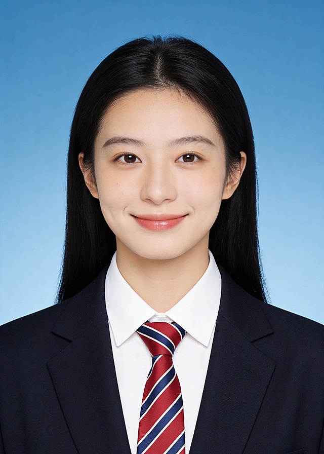 保留第一张图人物脸型、发型、年龄特征生成标准纯正面证件照;纯正面,人物居中(居中构图),位于画面中心,为视觉聚焦点,入境范围头部至胸部下方10cm以上区域,外穿深蓝色学院风针织背心,内搭白色翻领长袖衬衫,背心领口有白色和浅灰色条纹装饰,头肩比例合理,精致清透裸妆+唇色自然,淡妆冷调白皙;肤色嫩白通透;参考第二张图的人物占位和比例,50MM标准焦段,人物占画面80%,头顶至画面上边缘3%,头部发型完整,平视视角(镜头与人物视线齐平)眼神直视镜头;颈肩结构合理,姿态自然放松(左右预留环境空间)纯正面;去除一切饰品;光线均匀柔和,画质清晰,眼神灵动,澄澈,表情自然,头部完整,均匀肤色提亮肤色,修饰脸型,肤质哑光细腻,原生细腻肤质,轻透裸肌感,32K画质,去除人物之外的所有元素,零噪点降噪,简约蓝色纯色背景;严格按照第一张图的内容生成详情