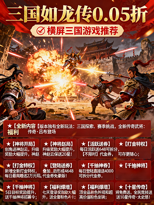 生成一款精致建模回合MMO游戏风格 酷技能炸裂全屏特效横屏三国手游风格的宣传图片30张,“三国如龙传0.05折、三国如龙传折扣手游、三国如龙传福利手游” 为主标题 “✅ 热门回合三国推荐、✅横屏三国游戏推荐、✅ 回合MMO游戏推荐、”为副标题,主标题每张不同,副标题平均分配。福利介绍为★【全新内容】版本独有全新玩法:三国探索、赛季挑战,全新传奇武将:传奇·吕布登场。更多新内容稳定周更,持续迭代 ★【神将开局】创角送神赵云,升级奖励大幅提升,神赵云保送20星! ★【活跃送券】每日活跃送648可拆分【不限时】代金券,可存更随心 ★【打金特权】新增全新打金特权,每日最高赠送2万元现金券,购买海量豪礼 ★【登陆送券】每日登陆直接送4000可拆分代金券,叠加后形成4648代金券免费版! ★【千抽神将】5日目标奖励提升,送千抽神将招募令 ★【福利爆增】七天登录奖励大幅提升,送全套粉色外观和超高价值粉色坐骑 ★【十星传奇】顶级品质传奇武将免费送,全民竞技送10星传奇·太史慈!详情