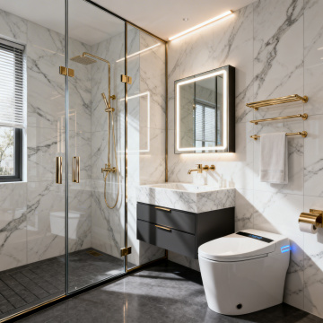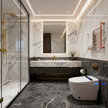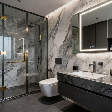 现代简约风格卫生间室内设计,整体采用灰白大理石纹理瓷砖墙面与地面,搭配黑色金属边框玻璃淋浴房,顶部嵌入式照明浴霸提供明亮均匀光线。左侧为白色台面洗手池,配黑色浴室柜与金色金属腿,台上放置洗漱用品;中央靠墙为白色智能马桶;右侧为扇形淋浴房,内挂灰色毛巾,配备银色淋浴喷头与手持花洒。窗户装有百叶窗,整体空间干净整洁,光影柔和,呈现出简洁、时尚、功能性强的卫浴环境,可替换为不同场景下的卫生间摆设布局。