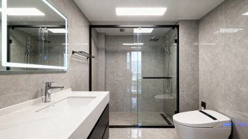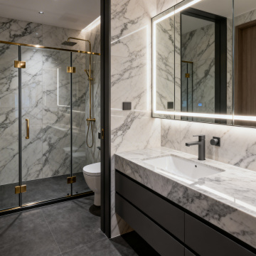 现代简约风格卫生间,整体采用白色大理石纹理瓷砖墙面与灰色地砖,搭配黑色金属边框的扇形玻璃淋浴房,内部设有银色淋浴喷头和挂杆,挂杆上搭着灰色毛巾。靠窗位置安装白色智能马桶,窗边有百叶窗,自然光透过窗户柔和照亮空间,天花板装有嵌入式照明和通风系统。左侧为黑白配色的浴室柜,台面为大理石材质,台上放置洗漱用品,整体空间干净整洁、光线明亮,具有清晰的线条感和现代设计感,呈现出不同场景下的卫生间摆设布局。