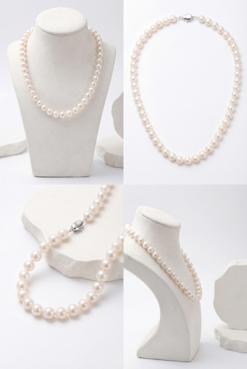多条银白色珍珠链子,圆润饱满的珍珠紧密串联,呈现出自然垂落与交错缠绕的姿态,珍珠表面光滑有细腻光泽,整体风格极简干净,背景为纯白色,光线柔和均匀,突出珍珠链子的优雅质感与流畅线条,无任何多余装饰元素。