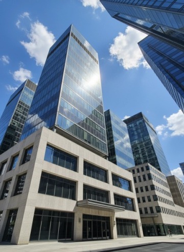 现代商务大楼,玻璃幕墙反射蓝天,简洁设计展现科技感与未来风。