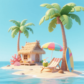 沙滩上有椰子树、珊瑚、茅草屋、沙滩椅、遮阳伞、椰汁饮料、冲浪板,淡蓝色背景