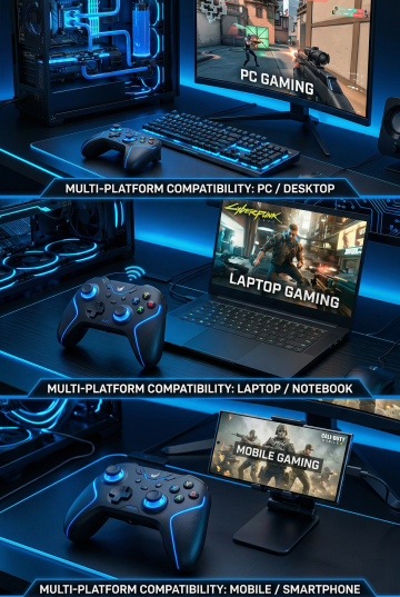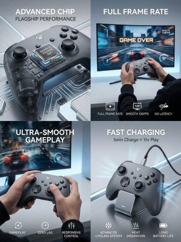 科技感十足的3D重拟物风格设计,金属质感与光影效果突出,展现未来游戏手柄的虚拟现实体验,融合高性能芯片、流畅帧率与快充技术。游戏手柄、游戏外设