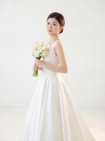 半身构图,身着白色无肩带抹胸裙的女性侧坐于透明亚克力椅上,左手轻搭椅背形成优雅的三角支撑,右手自然垂落轻抚裙摆褶皱,棕色微卷长发以珍珠发簪松松挽起,几缕发丝随肩部线条滑落至锁骨处。温柔杏眼微垂凝视前方虚化的白色郁金香花束,自然野生眉与浅棕色眼影形成柔和渐变,内眼线在眼尾处微微上扬,裸粉色唇釉泛着水光感,金色圆形耳环在柔和顶光下折射出细碎光斑。纯净的乳白色背景中,人物左侧脸颊至锁骨处有渐变的柔光阴影,裙摆垂坠感自然,整体氛围如晨雾中的瓷器般清新雅致,凸显温婉气质与立体五官。