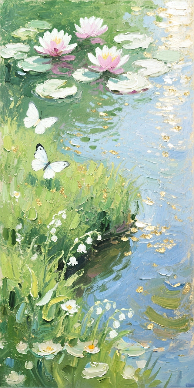 印象派油画风格,莫奈睡莲系列,以紫色、蓝色、淡粉色为主色调,水面波光粼粼,光影交错,睡莲花朵点缀其间,笔触厚重而富有层次感,色彩柔和交融,营造出宁静悠远的氛围,水面上漂浮着大小不一的荷叶,部分荷叶呈现出淡淡的黄色和绿色,整体构图饱满,光影效果自然,展现出水面的清澈与梦幻,色彩过渡自然和谐,具有浓厚的艺术感染力和印象派特有的光影捕捉技巧。详情