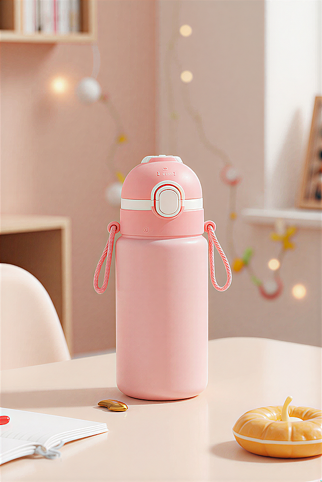 将原图中的保温瓶放在舒适的木桌上,木桌周围摆放一本打开的笔记本,还有散布的咖啡豆,保留原保温瓶粉色外观,整体画面自然舒适,风格温馨写实详情
