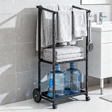 现代简约家居风格的亚马逊主图,明亮洁净的浴室场景,3/4侧面中央放置黑色纹理金属置物架。顶层挂2-3条蓬松大浴巾和小毯子,中层叠放整齐毛巾,下层放置2个5加仑水桶,侧面挂钩挂衣物刷。置物架底部轮子清晰可见,其中一个微微离地。金属杆和轮子上有微小水珠特效,突出防潮防锈特性。背景为浅灰色瓷砖墙和白色洗手台,整体光线明亮柔和,突出产品高端质感与实用功能。