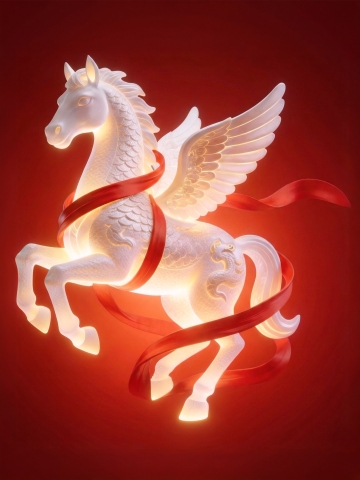梦幻光影中,翼马腾跃,中式龙纹浮雕与鎏金玻璃质感交织,红绸缠绕,尽显神圣优雅的3D重拟物风。