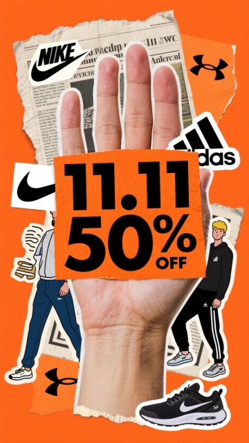撕纸拼贴风融合波普艺术,手握“11.11 50% OFF”橙色标签,品牌LOGO与人物剪影错落叠置,强化促销视觉冲击。