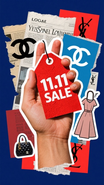 拼贴风海报,撕纸质感叠加时尚品牌元素,手握“11.11 SALE”标签,融合波普艺术与杂志风,传递奢华促销感。