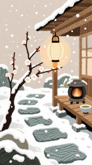 刺绣风插画,融合中式庭院与浮世绘意境,雪中梅花、暖灯与茶炉营造静谧温馨的冬日氛围。