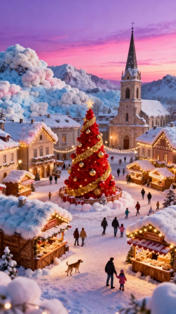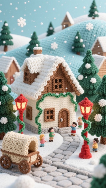 毛线编织的冬日小镇,融汇刺绣风与微缩艺术,卡通人物在雪中嬉戏,暖灯映照出温馨梦幻的圣诞氛围。