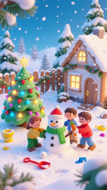 软3D风微缩艺术场景,卡通人物堆雪人,温馨喜庆圣诞夜,粘土质感萌趣十足。