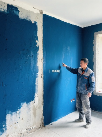 实景感与工业风交融,厚涂肌理呈现干油墨与印刷质感,粗野主义风格凸显质朴力量,工人指向墙面“一底两面”,展现施工细节与艺术张力。