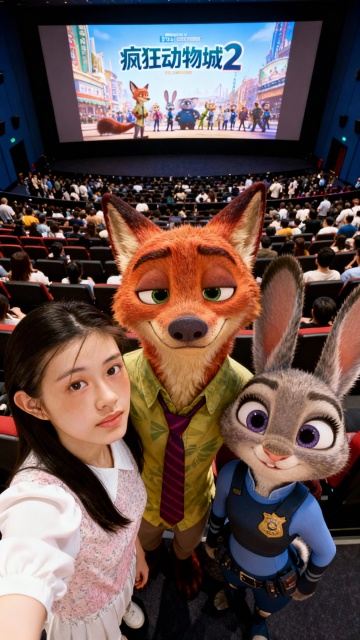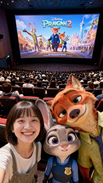 卡通感与拟人风结合,3D动画角色栩栩如生,梦幻感十足的影院场景,展现《疯狂动物城2》的动漫魅力与虚拟现实沉浸体验。