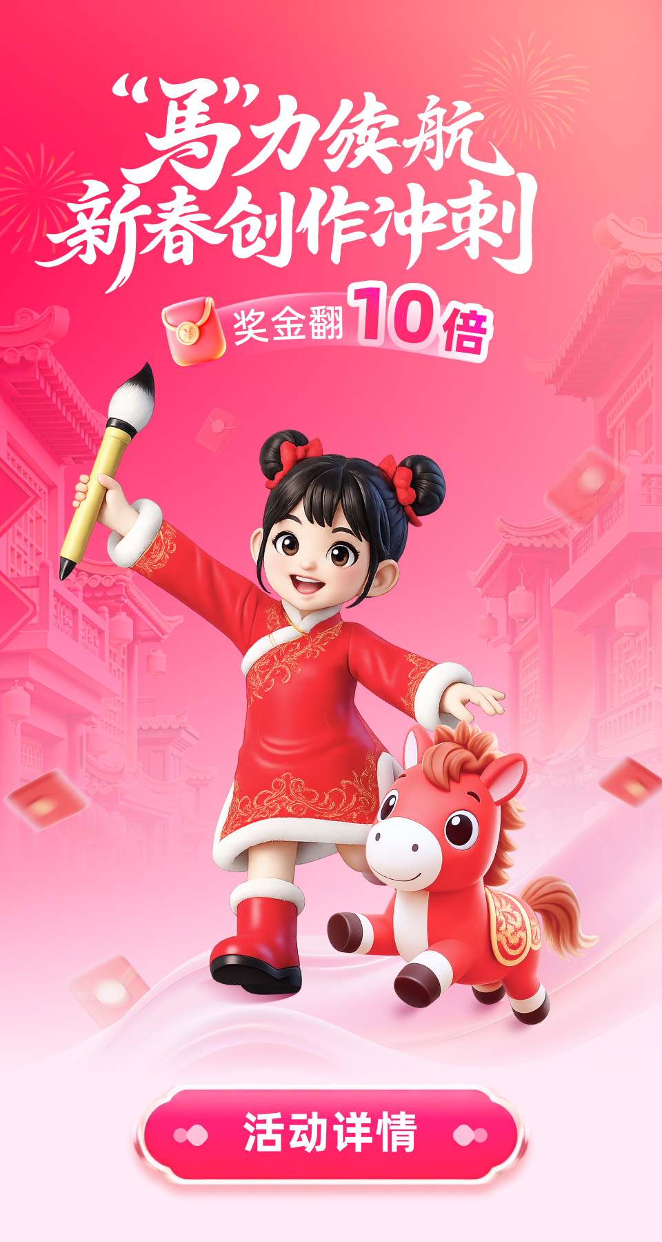 像素复古游戏风,红金公主马与马里奥式问号砖、满屏金币结合,红金撞色,营造富贵喜庆的马年暴富氛围。