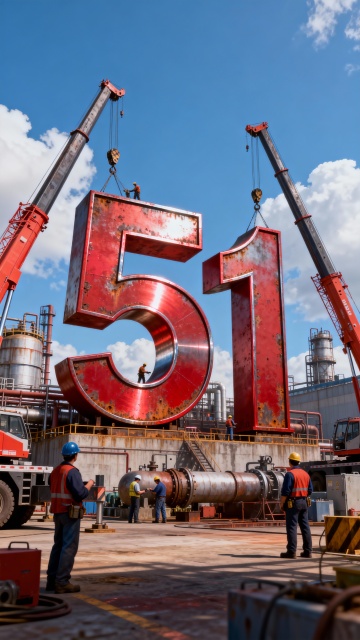 工业风金属质感巨幅“51”数字装置,粗野主义风格,起重机吊装,工人协作,节日庆典氛围浓厚。