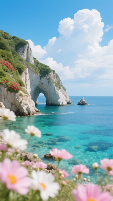 水彩风海岸,花海映衬碧海蓝天,清新浪漫,梦幻唯美。