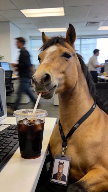 一只放松的马以自拍视角,带着略显厌烦又疲惫的表情,懒洋洋地从装着黑色冰咖啡和冰块的透明外带咖啡杯中啜饮,吸管清晰可见地叼在嘴里。脖子上挂着有它头像照片的挂绳工牌。它的工位上有键盘,背景是办公区,有走动的员工。画面看起来就像一张真实的抓拍照片。
