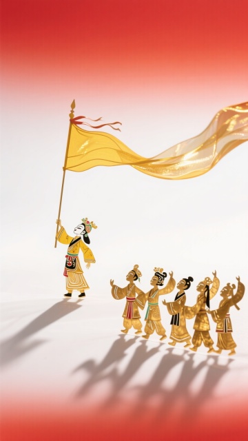 剪纸风与皮影风融合的中式插画,鎏金人物行进于红白渐变背景,手持黄旗,古典喜庆氛围浓厚,彰显民族仪式感。