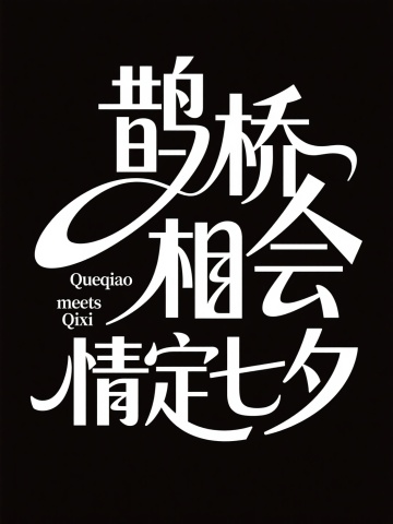 黑色背景,白色字,创意字体设计,流畅且富有艺术感,中文"鹊桥相会 情定七夕",设计灵感:将字体进行抽象变形,给人以强烈的视觉冲击。高级感,扁平化,大师作品,小字"Queqiao meets Qixi