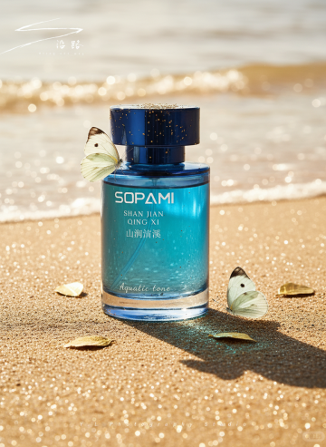 玻璃风瓶身置于清冽溪流,液态光影交织,静谧自然中透出清爽与清透感,虚拟与实景交融,如夏日沁凉之息。