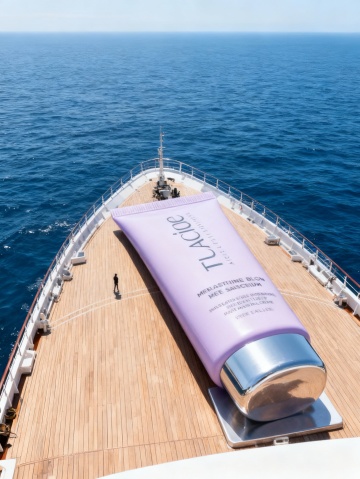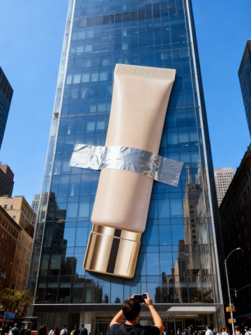 现代感与未来感交织,巨型3D化妆品管身贴于玻璃幕墙,金属风与重拟物风碰撞,冲击感十足,城市街头的超级符号艺术装置。