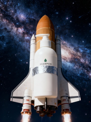 清新自然的轻拟物风设计,巨型洗发水瓶与草地实景结合,简约主义美学呈现清爽舒适感,传递夏日活力与纯净体验。