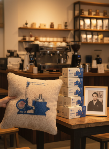 复古工业风刺绣抱枕,蓝白双色设计,搭配质朴面料与实景咖啡馆场景,极繁主义细节呈现舒适质感。