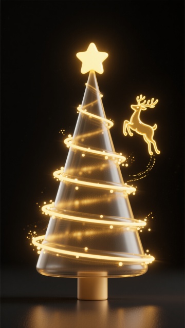 玻璃风圣诞树搭配鎏金霓虹鹿,3D光影交织,梦幻奢华中透出温馨优雅,节日氛围唯美动人。