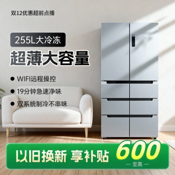 现代简约风格,3D实景渲染,金属质感冰箱搭配温馨家居场景,重拟物设计突出科技与舒适感,双12促销氛围浓厚。