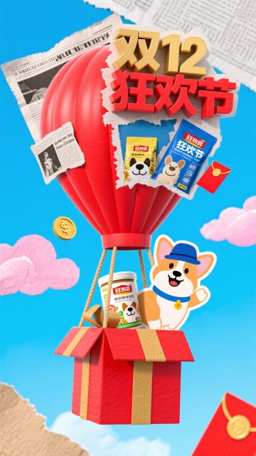 毛茸茸的3D数字“1212”悬浮夜空,搭配闪耀星星与礼物盒,营造梦幻喜庆氛围,重拟物风格强化体积感与膨胀效果,传递双十二狂欢购物节的极致视觉体验。