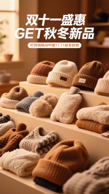 温暖质朴的秋冬家居场景,轻拟物风搭配真实面料质感,营造温馨舒适氛围,传递双十一节日购物的惬意与期待。