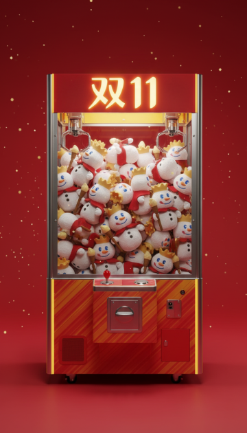 软3D风格抓娃娃机,满载可爱雪人玩偶,霓虹“双11”字样闪耀,红金配色营造喜庆促销氛围,卡通感十足。