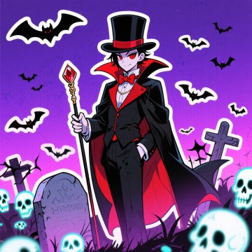哥特风格与动漫风融合,神秘感十足的吸血鬼角色立于墓地,霓虹灯色调点缀,蝙蝠与骷髅环绕,酷炫又充满卡通感。