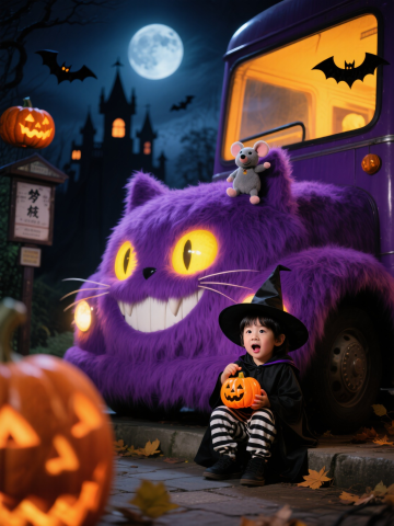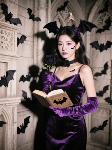 哥特风少女手持黑玫瑰与魔法书,紫绒长裙映衬神秘光影,蝙蝠剪影环绕,皮影质感与复古雕花建筑交织,尽显奢华优雅的梦幻万圣夜。