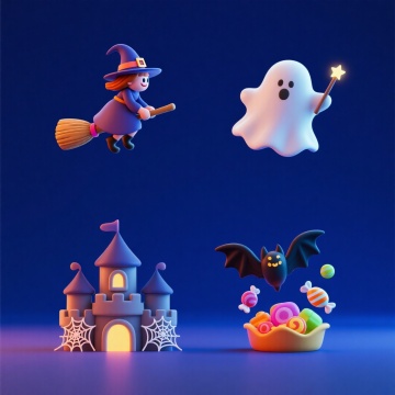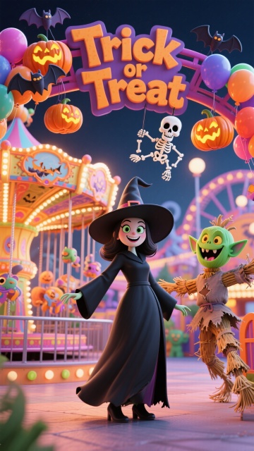卡通感与3D风结合,拟人化的巫师与稻草人欢庆万圣节,梦幻灯光与软塑料质感营造出喜庆的虚拟现实游乐场氛围。