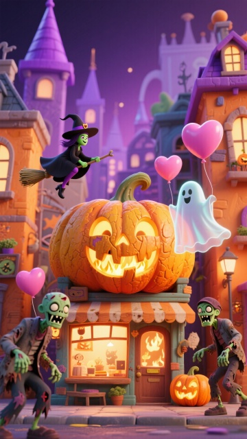 梦幻3D风卡通场景,拟人化南瓜店与萌趣僵尸、巫婆共庆万圣节,软粘土质感融合超现实元素,粉色心形气球增添喜庆趣味感。