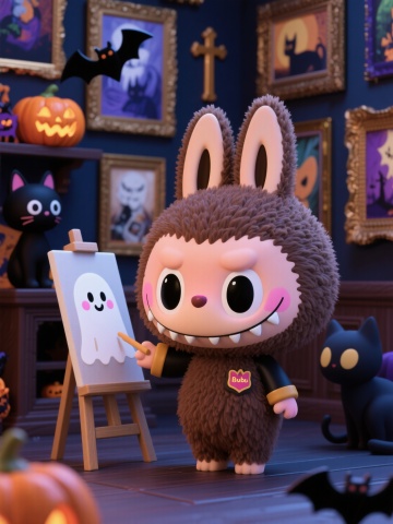 卡通感与3D风结合,拟人化的万圣角色围桌打牌,霓虹灯拱门闪耀“Happy Halloween”,梦幻又喜庆的超现实都市夜景。