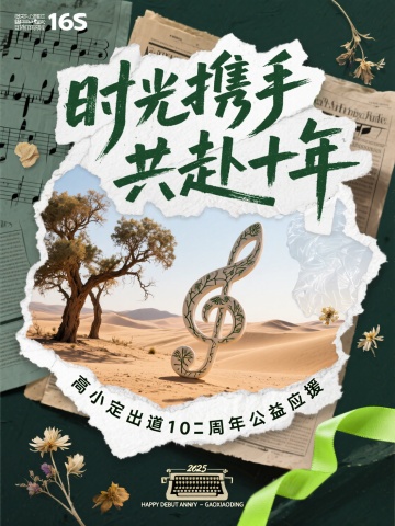 清新撕纸风,大字拼贴设计,沙漠绿植与音符交织,庆祝出道十周年。